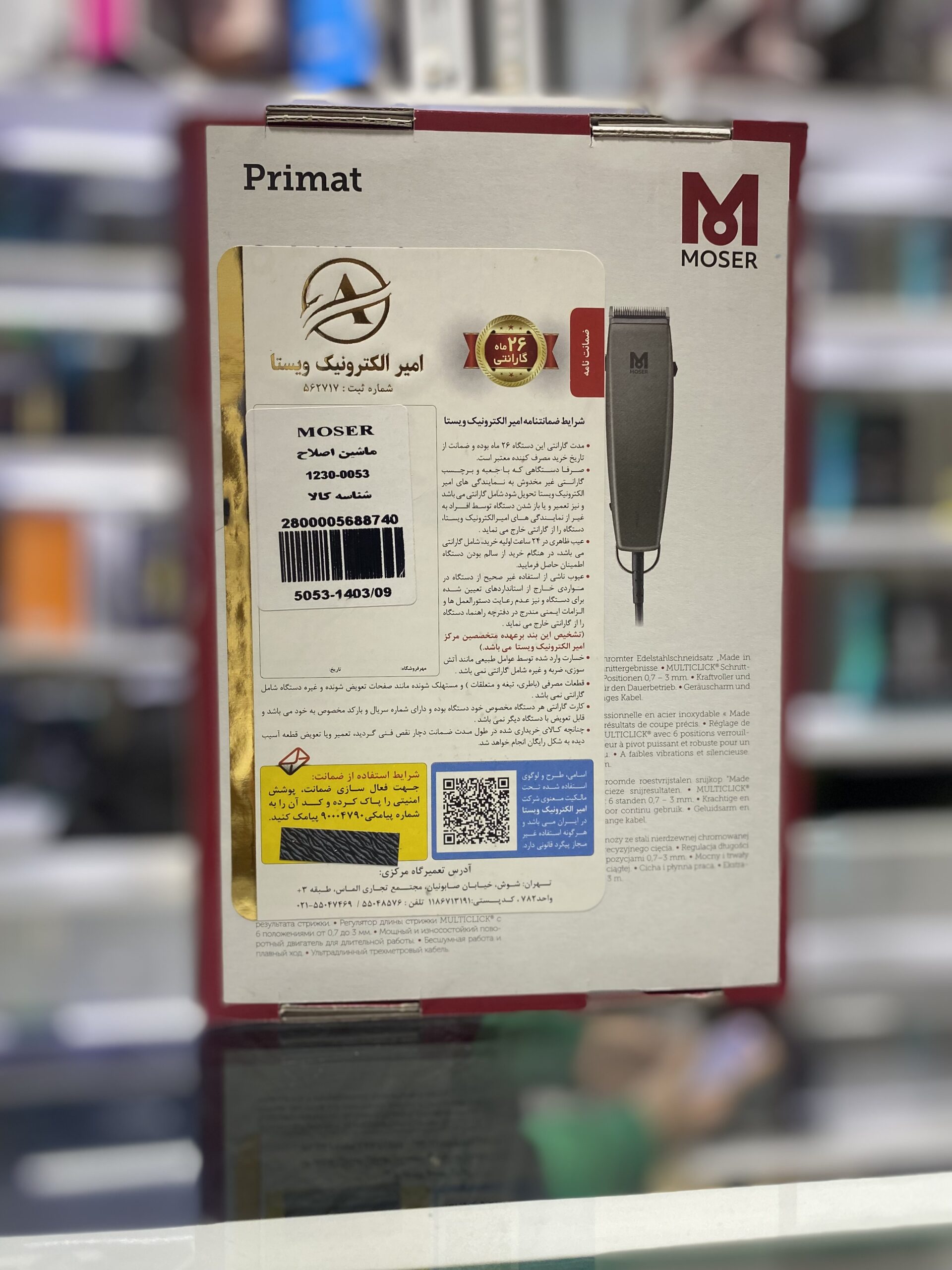 ماشین اصلاح موزر مدل primat 1230-0053 دارای تیغه ضد زنگ تمام استیل قابل تنظیم در 6 دنده (0.2 تا 3 میلی متر) می باشد .ماشین اصلاح موی سر و صورت مدل primat 1230-0053 دارای موتور کم صدا و پر قدرت و ساخت کشور آلمان است.طول سیم آن نیز 3 متر می باشد و این امکان را برای کاربر فراهم می کند تا به آسانی بتواند از آن استفاده کند.ماشین اصلاح موزر پریمات 1230 به صورت برق مستقیم (با سیم) قابل استفاده است و همچنین دارای 2 شانه اصلاح در 2 اندازه‌ی 4.5 و 9 میلی‌متر ، برس تمیزکننده و روغن می باشد.میزان سرعت چرخش تیغه ها در هر دقیقه برابر با 3000 دور است.
